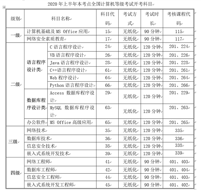 5.2020年9月二级VisualBasic语言程序设计(科目代码26)将进行最后一次组考,2020年12月起停考该科目; 2020年9月新增三级Linux应用与开发技术(科目代码71)、四级Linux应用与开发工程师(科目代码46)两个科目。四级Linux应用于开发工程师考试课程为“401、402”。
