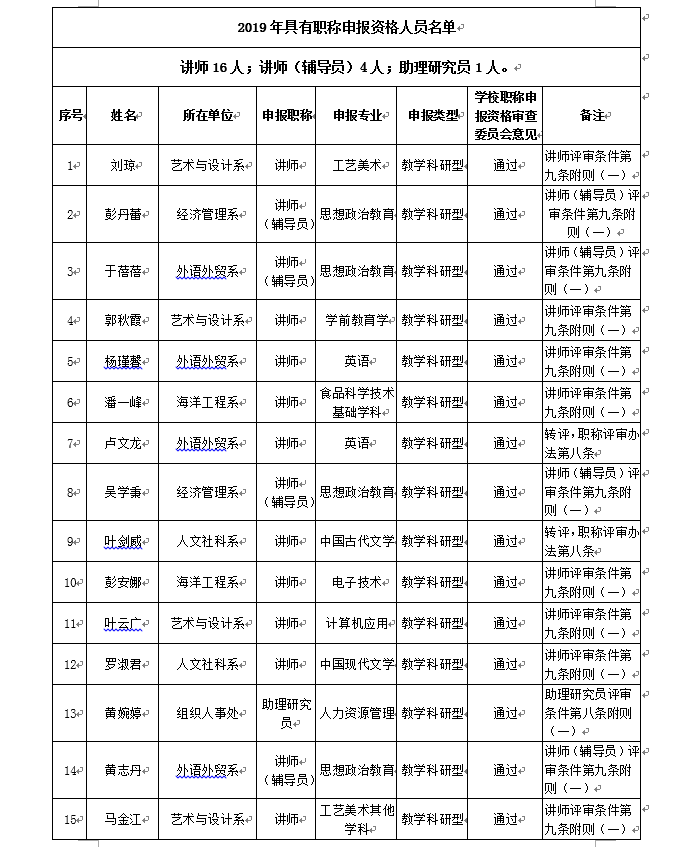 根据《bwin必赢职称评审制度(试行)》(必赢发〔2019〕32号)、《bwin必赢2019年职称评审工作方案》(必赢〔2019〕25号)文件要求,经各部门推荐、相关职能部门审核,学校职称申报资格审查委员会复审,拟同意刘琼等21名同志具备相应职级申报资格。现将名单及其基本情况公示如下(具体信息详见附件)。