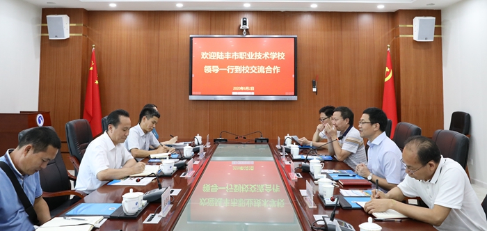 6月2日,陆丰市职业技术学校校长张鑫一行5人到我校交流学习,校长蔡昭权教授,副校长傅凤龙及相关部门负责人热情接待了来访客人并参加了座谈会。