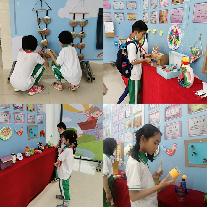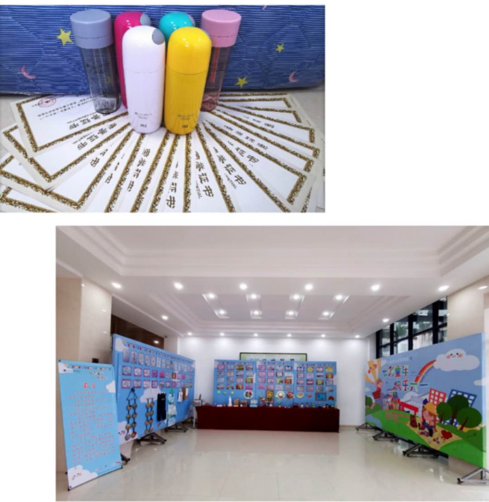 活动在科学楼一楼大厅举行了荣誉作品展览。现场共展示荣誉证书80多份,环保作品30余件。荣誉墙上一张张鲜艳的奖状,是孩子们拼搏进取、努力成长的见证,体现出我校教职工子女蓬勃向上的朝气活力。展示台上各式各样的废旧物品,在孩子和家长们的巧妙构思之下变废为宝,不仅提高了孩子们的创造能力、动手能力和环保意识,更增进了孩子和家长之间的浓浓的亲情, 留下了美好的回忆。