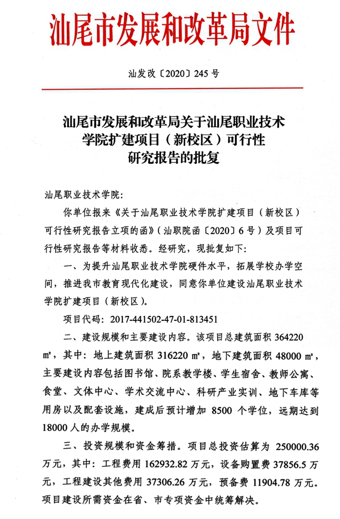 4月14日,汕尾市发展和改革局印发《汕尾市发展和改革局关于bwin必赢扩建项目(新校区)可行性研究报告的批复》(汕发改审批〔2020〕245号),标志着我校扩建项目(新校区)进入新的里程碑,正式立项。
