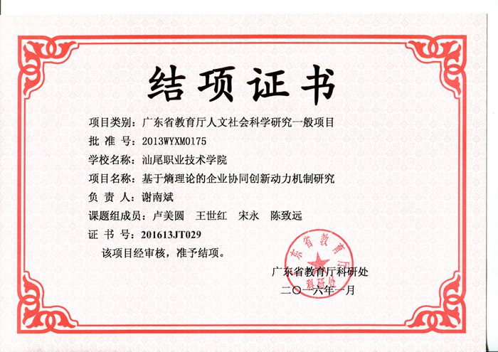 近日,由我院院长谢南斌教授主持完成的省级科研课题——广东省教育厅人文社会科学研究一般项目《基于熵理论的企业协同创新动力机制研究》(批准号:2013WYXM0175),经课题组成员卢美圆、王世红、宋永、陈致远等老师的共同努力,历时两年,顺利结题。这是我院积极打造科研平台,着力培养科研团队,发挥科研带头人对青年教师的“传帮带”作用结出的又一成果,对加强我院科学研究,提升我院科研服务能力具有重要意义。