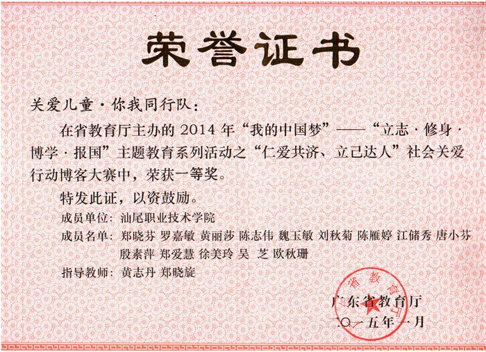“我的中国梦”——“立志、修身、博学、报国”主题系列教育活动之“仁爱共济、立己达人”社会关爱行动博客大赛,一等奖。