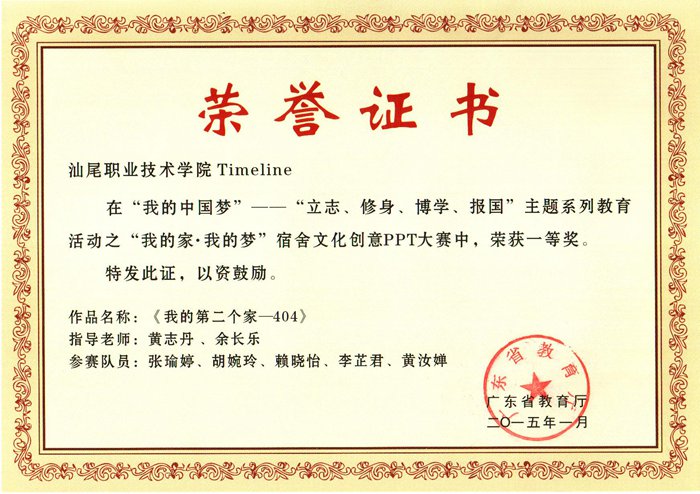 “我的中国梦”——“立志、修身、博学、报国”主题系列教育活动之 “我的家·我的梦”宿舍文化创意PPT大赛,一等奖。