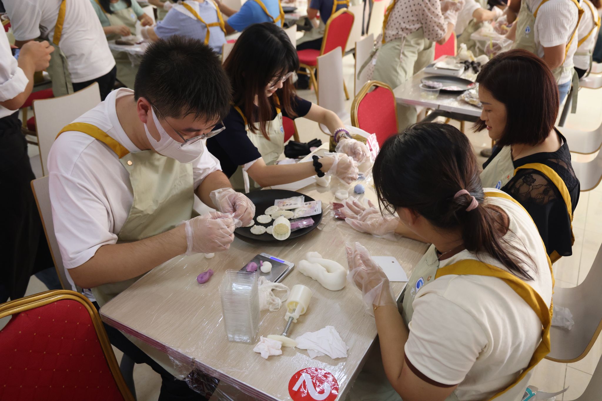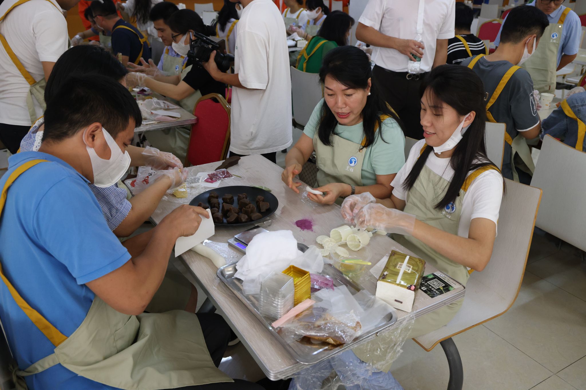 比赛现场,选手们舞动娴熟的巧手,按照制作步骤开动脑筋,挥洒奇思妙想,依次将馅料迅速揉团、包馅、用模具印出漂亮的图案与形状,制作成自己的创意月饼。现场笑声不断、处处洋溢着欢乐祥和的中秋节日氛围。