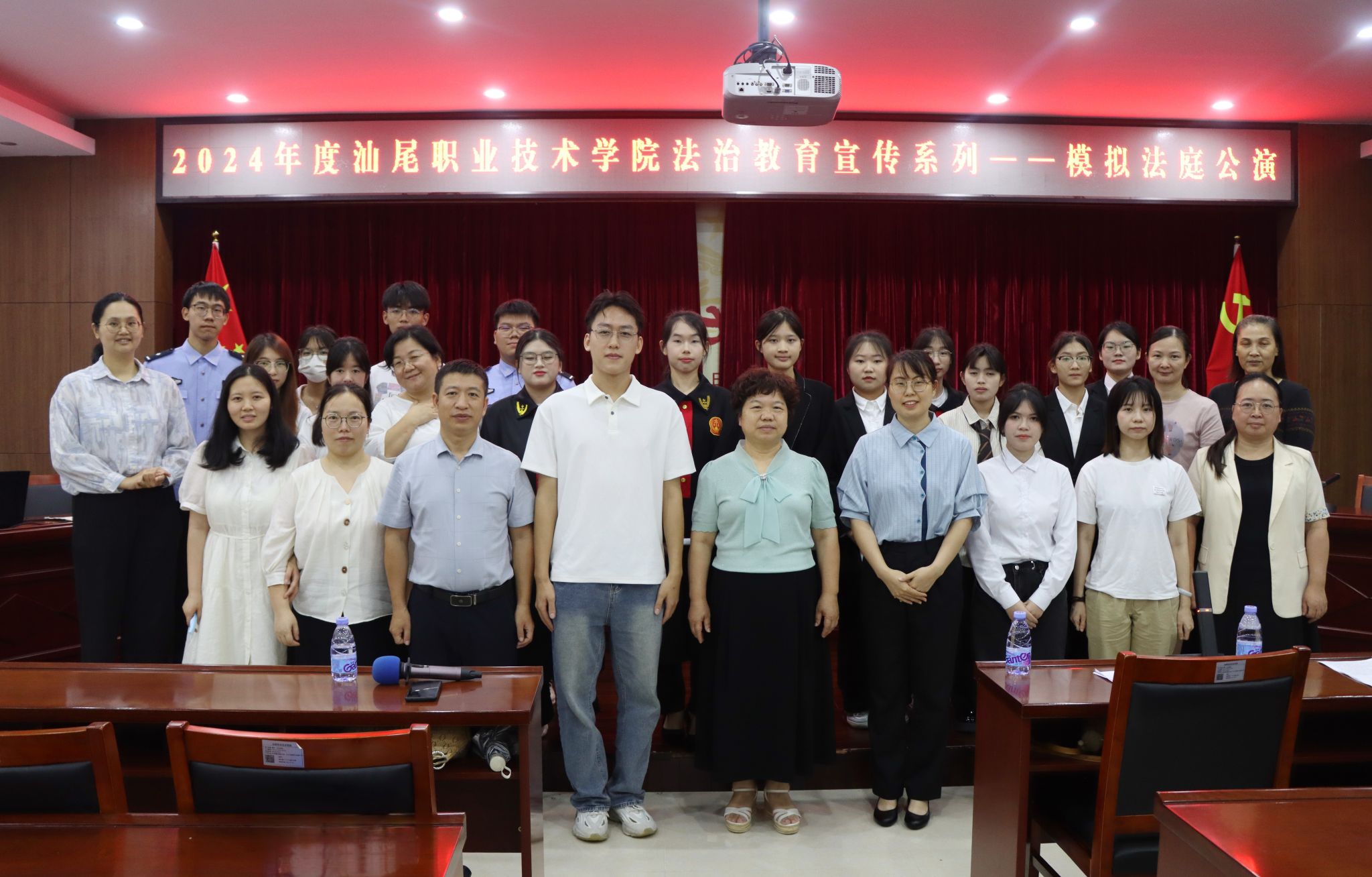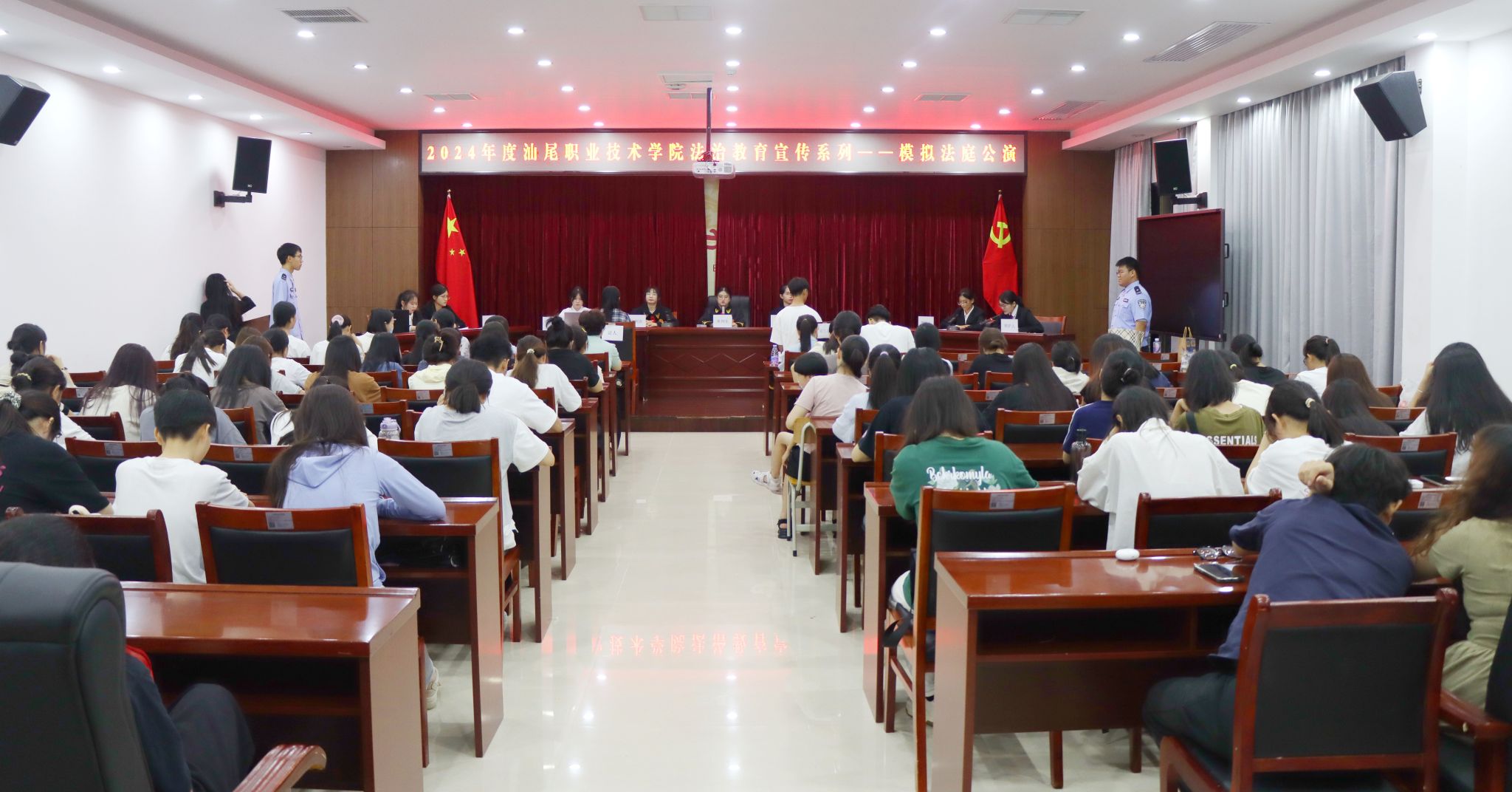 近日,我校2024年度法治教育宣传系列活动之一——模拟法庭公演活动在科学楼四楼会议室举行,活动得到汕尾市中级人民法院大力支持,由马克思主义学院社会主义核心价值观传播与研究中心主办,生雅利老师全程指导,2023级学生代表共计100多人参加了旁听。汕尾市中级人民法院两位法官助理徐飞玲、范智派出席了此次活动。